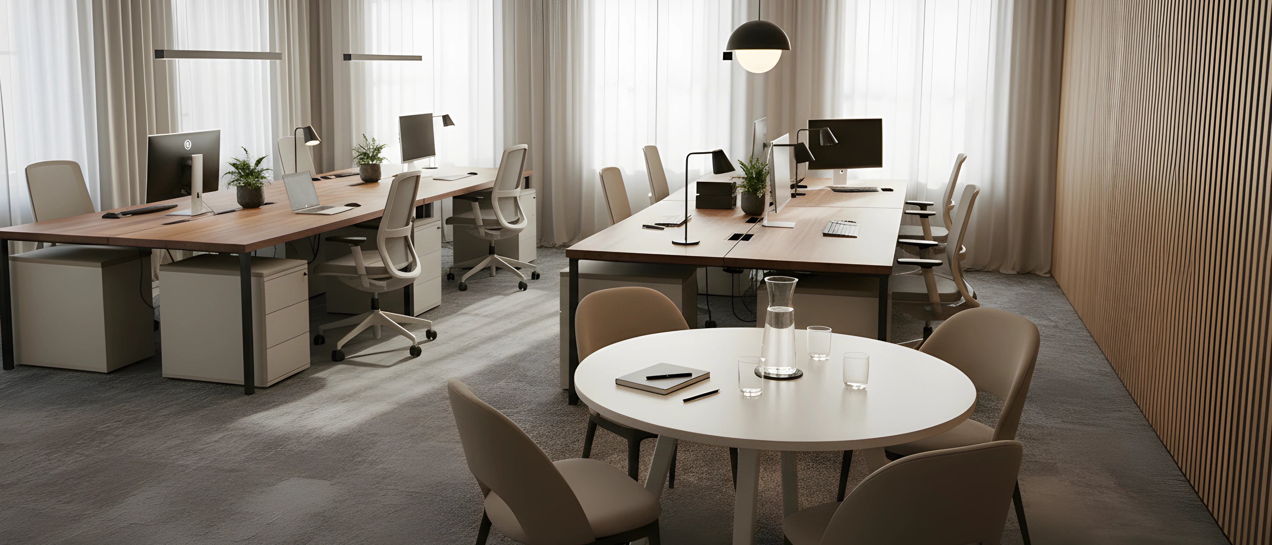 Wir vertreiben die kühle Sterilität aus dem Arbeitsalltag. Der Schlüssel liegt für uns in der Ruhe: Mit akustisch wirksamen Hölzern und Textilien nehmen wir dem Raum den Hall und schaffen Stille für echten Fokus. Wir gestalten fließende Übergänge zwischen konzentrierter Arbeit am Schreibtisch und offenem Austausch am Besprechungstisch. So entsteht eine Atmosphäre, in der man auch nach vielen Stunden noch einen klaren Kopf behält.