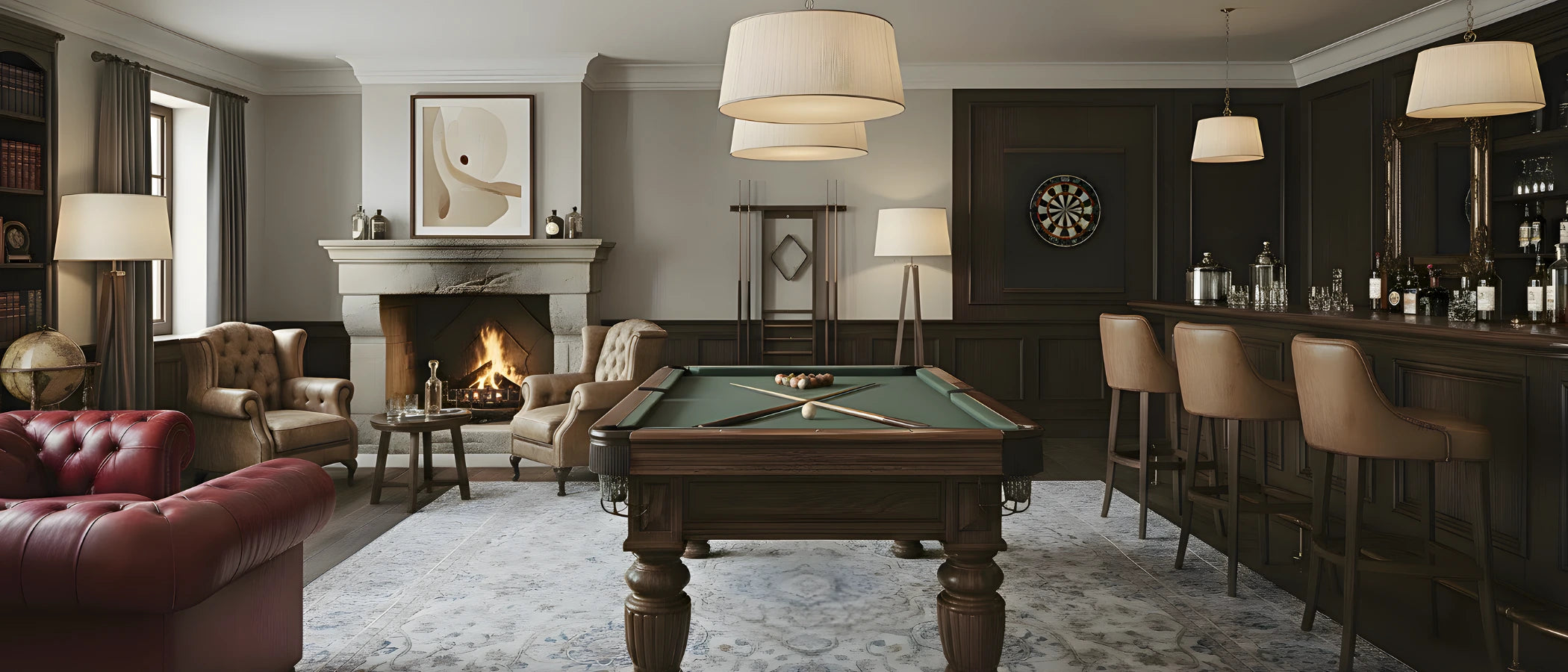 Wir schaffen eine Welt mit eigener Zeitrechnung. Wir setzen auf Tiefe und Substanz: Dunkle Hölzer, edles Leder und schwere Stoffe dämpfen die Welt da draußen und sorgen für eine intime Akustik. Wir inszenieren das Licht so, dass es Stimmung erzeugt, statt nur zu beleuchten. Ob für eine Partie Billard oder ein Gespräch an der Hausbar – wir gestalten diesen Raum als stilvolle Kulisse für deine besten Stunden.