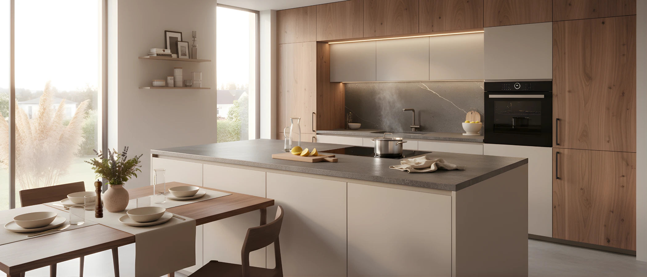 Wir verbinden klare Funktionalität mit reiner Sinnlichkeit. Wir schaffen ergonomische Abläufe, verpackt in edle Materialien, die man berühren will. Warmes Naturholz trifft auf widerstandsfähige Oberflächen und ein Lichtkonzept, das den Raum inszeniert. So entsteht ein Ort, der Arbeitsplatz und Wohlfühloase zugleich ist – so gemütlich, dass deine Gäste oft gar nicht mehr ins Wohnzimmer weitergehen wollen.