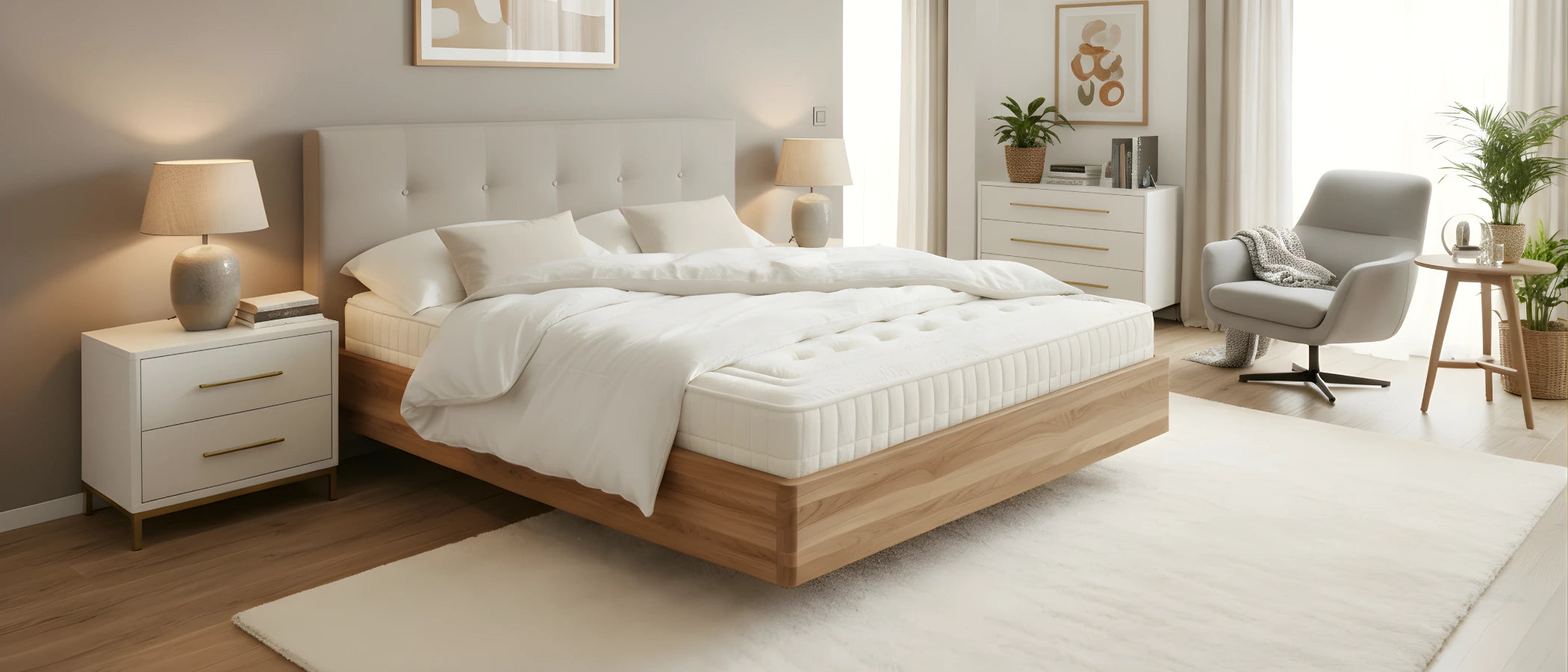 Wir schaffen eine Atmosphäre der Stille. Mit Materialien, die atmen, und Düften, die beruhigen. Wir ersetzen visuelle Unruhe durch klare Linien und haptische Wärme. Wir entwerfen diesen Raum so, dass er dich jeden Abend sanft empfängt und jeden Morgen gestärkt entlässt.