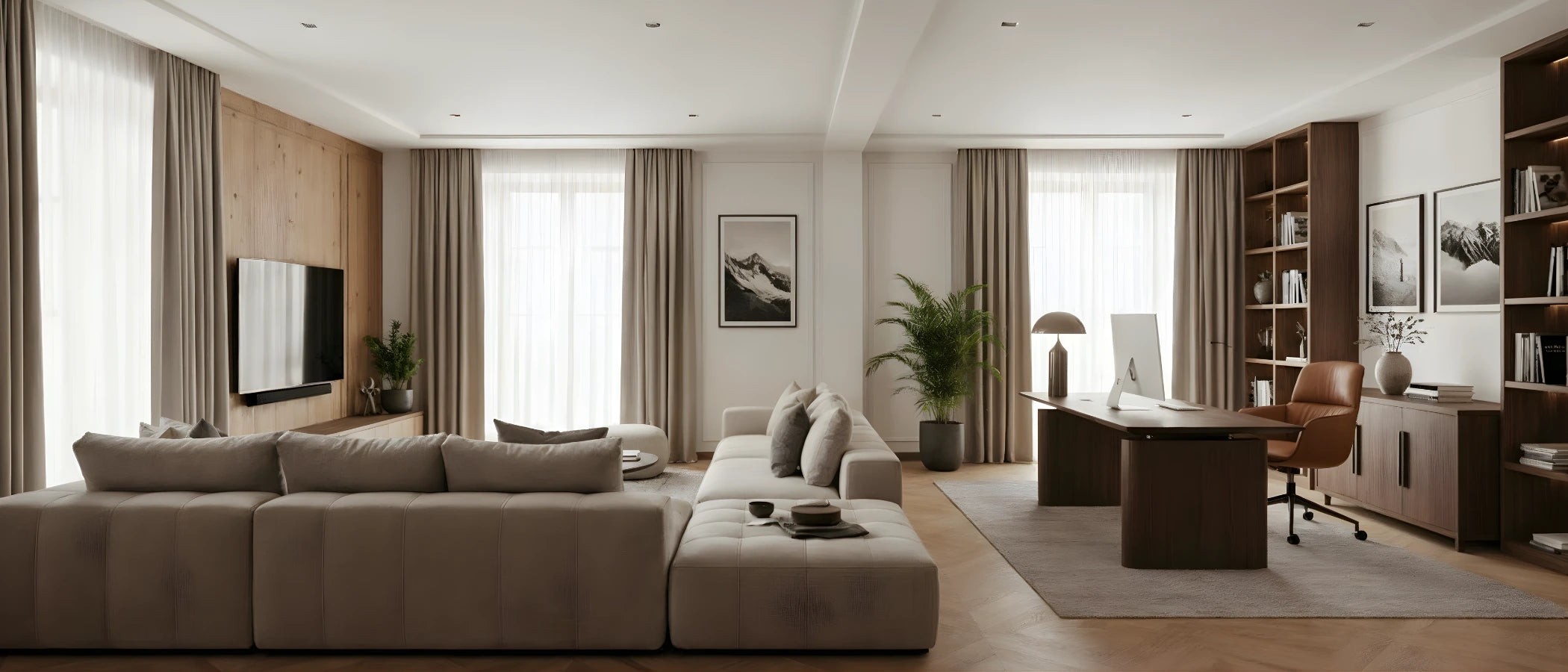 Wir verwandeln kühle Flächen in behagliche Lebensräume. Durch den gezielten Einsatz von Textilien und natürlichen Oberflächen zähmen wir die Raumakustik und schaffen Wärme. Ob gemütliche Sitzlandschaft oder integrierter Arbeitsplatz: Wir sorgen für eine Balance aus Funktionalität und Ästhetik. Mit einem durchdachten Lichtkonzept und tiefen, erdigen Tönen schaffen wir eine Kulisse, in der du und deine Gäste gerne verweilen.